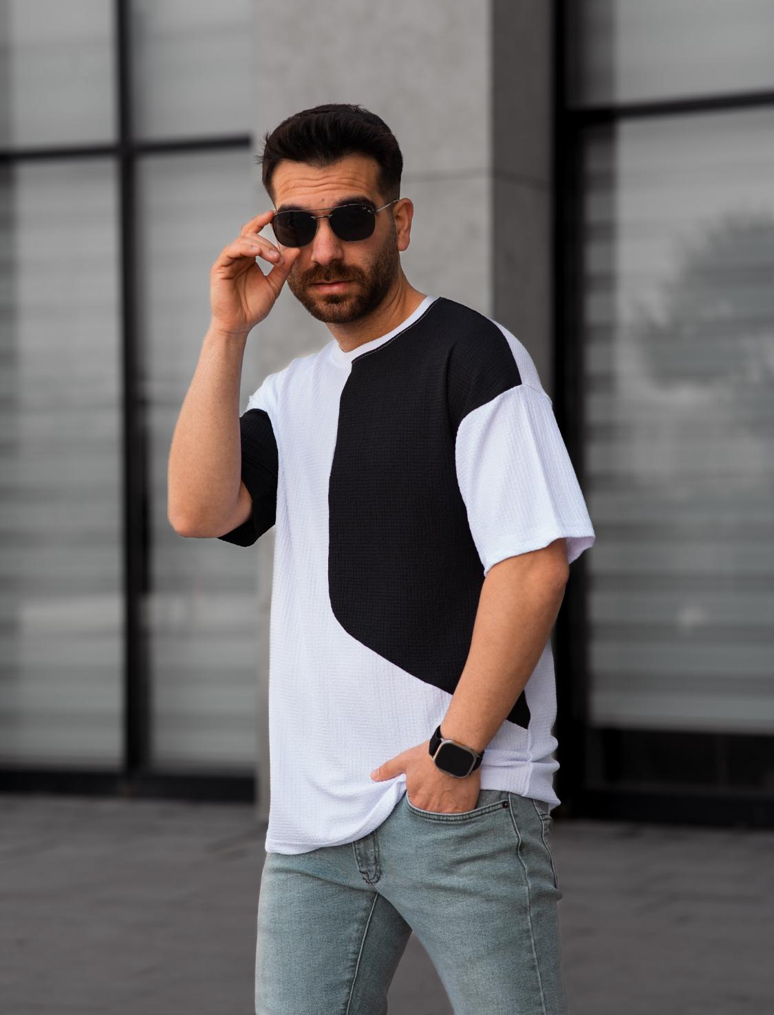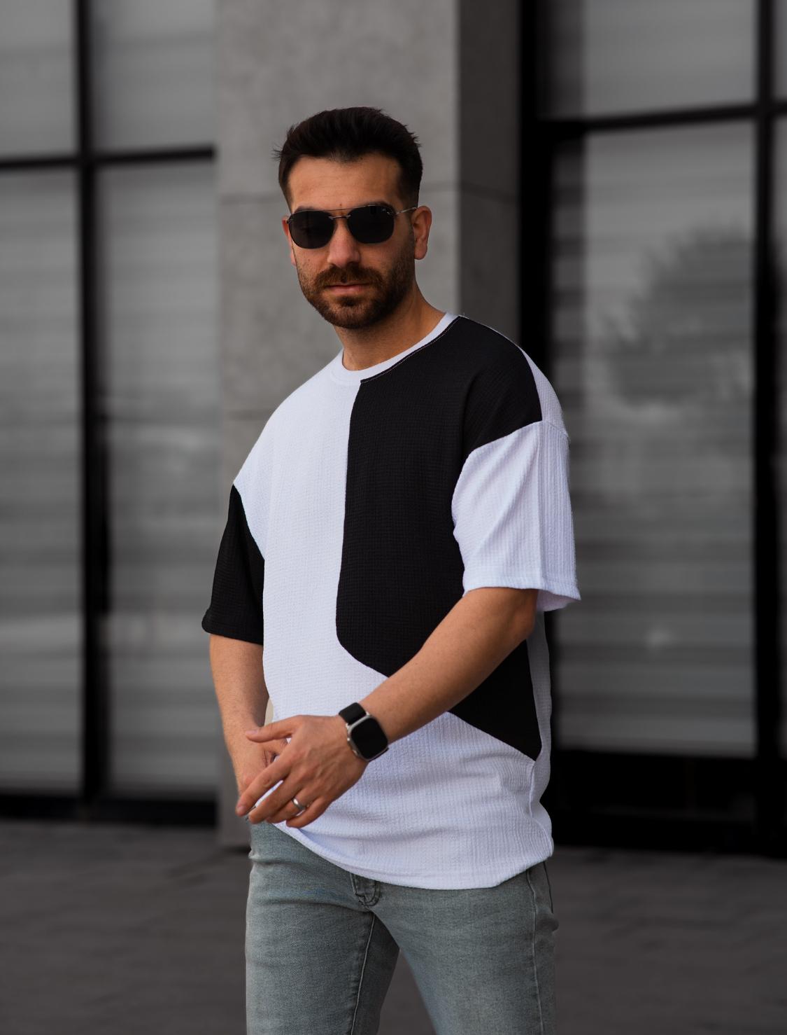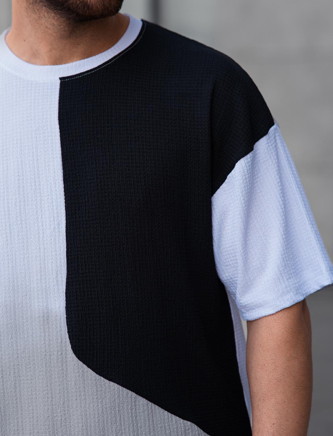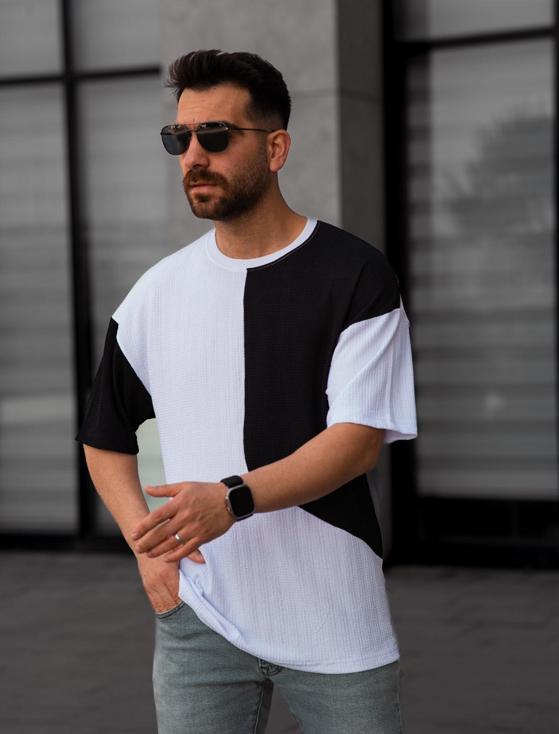 Тази стилна овърсайз тениска се отличава с уникална набрана текстура и контрастни панели в цветове черно и бяло, което придава модерно и свежо излъчване. Подходяща за всеки, който иска да се открои с нещо различно.