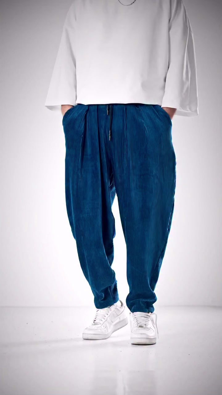 Вкарай мек лукс в street визията си с Velvet Sand – тъмно син плисиран шалвар тип джогър от кадифена материя. Еластичната талия с връзки и свободната кройка дават комфорт и свобода на движението, а текстурата „кадифе“ прави модела идеален както за градски сет, така и за по-стилни casual комбинации.