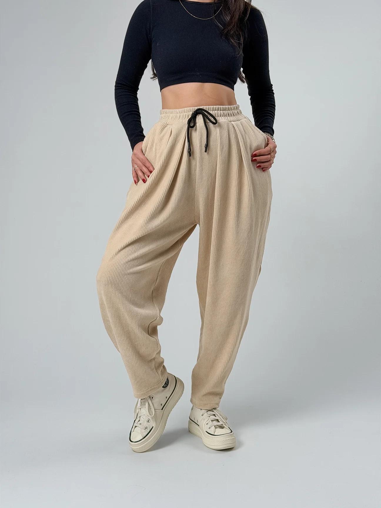 Подчертай своя urban стил с Velvet Sand – дамски плисиран панталон тип джогър от мека кадифена материя. Свободната кройка и еластичната талия с връзки дават пълен комфорт, а нежният бежов цвят прави модела идеален както за ежедневието, така и за по-стилизирани street визии.